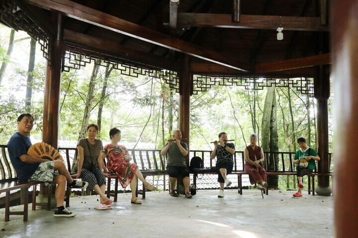 葱茏绿意中,一阵阵悦耳动听的乐声和歌声传来,只见避暑客们正三三两两聚于凉亭下,或弹奏乐器,或随着音乐舞蹈,或在一旁话着家常,阳光从绿叶间隙中洒下来印在每个人的脸上,画面温馨和谐。
