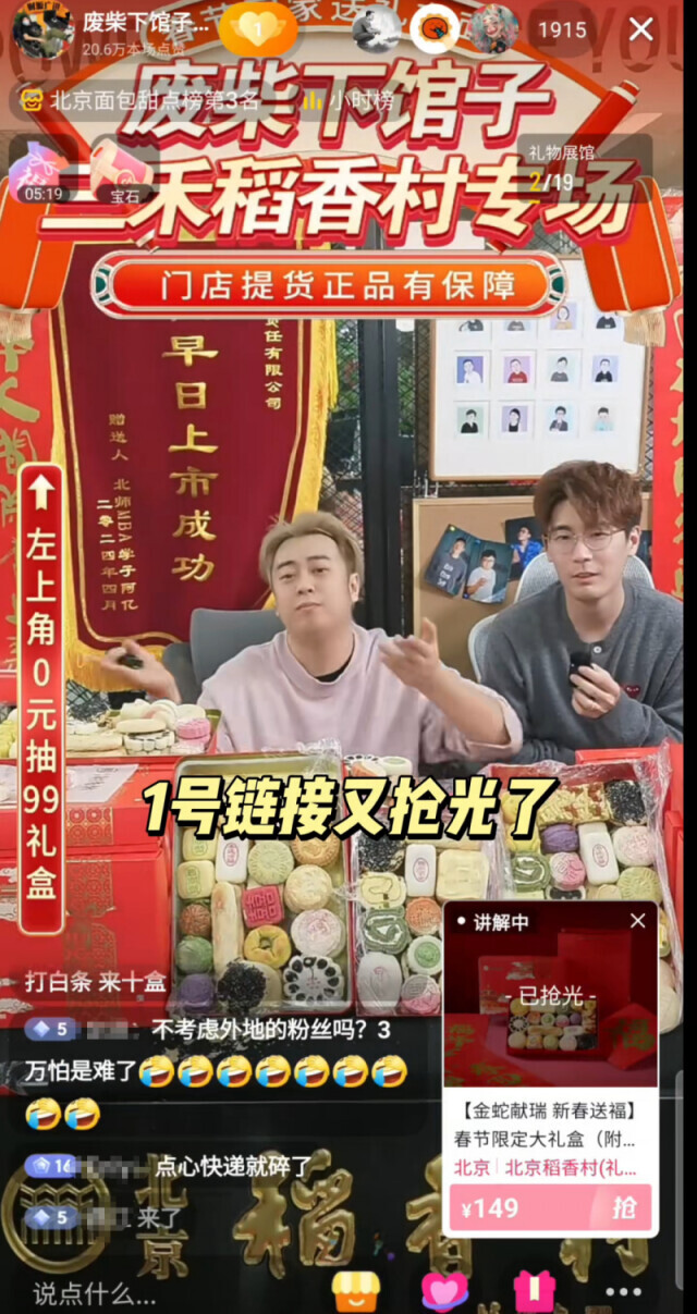 在平台撮合下,2024年12月31日开始,北京稻香村陆续邀请「废柴下馆子」「三好是三好」「小叶逛吃日记」「阿亮来了(杯子团队)」等高粉达人到门店直播。这一波「春节攻势」为品牌带来超过3000万的GMV。仅今年1月10日「废柴下馆子」的一场直播,就为品牌拉新2851人、老客激活803人。