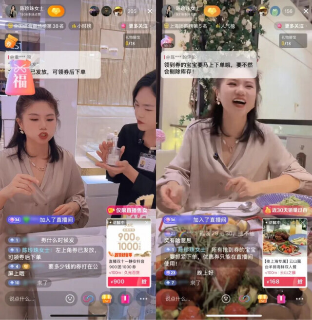 本地生活直播不同于电商直播的很重要一点,恰在于线下的人间烟火气,以及即便是同一品牌都有可能千店千面的复杂性,或者说丰富度。陈珍珠在久光百货直播时,恰好商场有个外场的美妆市集,有一个首发券活动力度特别大。她直接就跑到外场,在直播间给大家一个所见即所得的感觉,「效果非常好」。