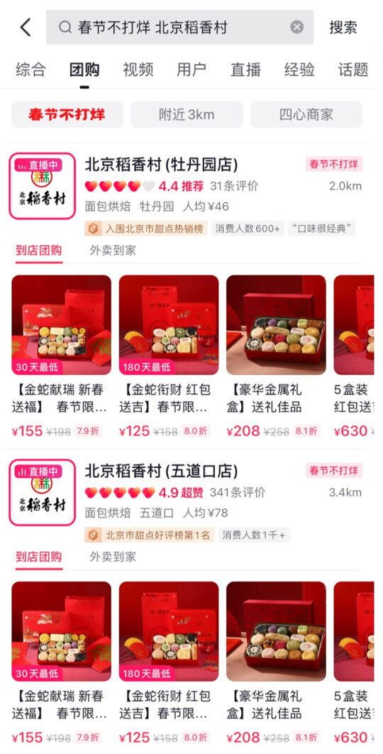 据悉,这款礼盒内含北京稻香村与福娃之父韩美林合作推出的新春福字及蛇年红包,除了品牌方自身给予的福利,抖音生活服务平台也提供了部分资源补贴。此外,为了线上线下一站式解决用户购置年货需求,北京稻香村线下100多家门店当时均设置了抖音专属窗口。