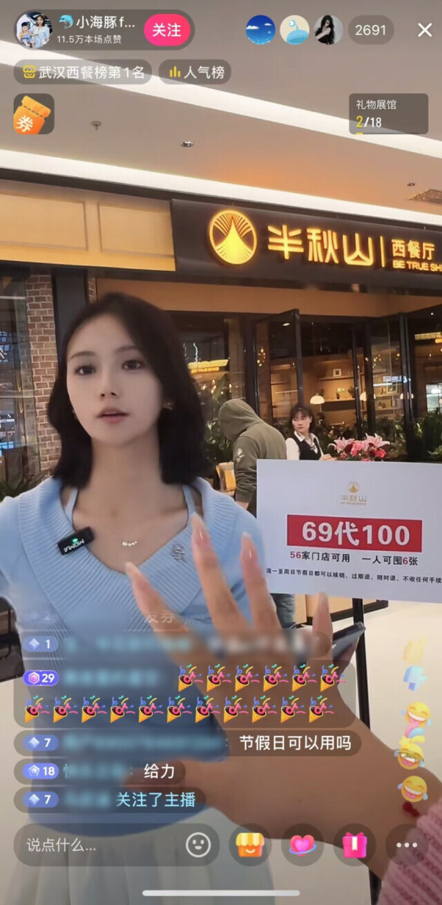 ▲「小海豚family」在武汉半秋山西餐厅直播
