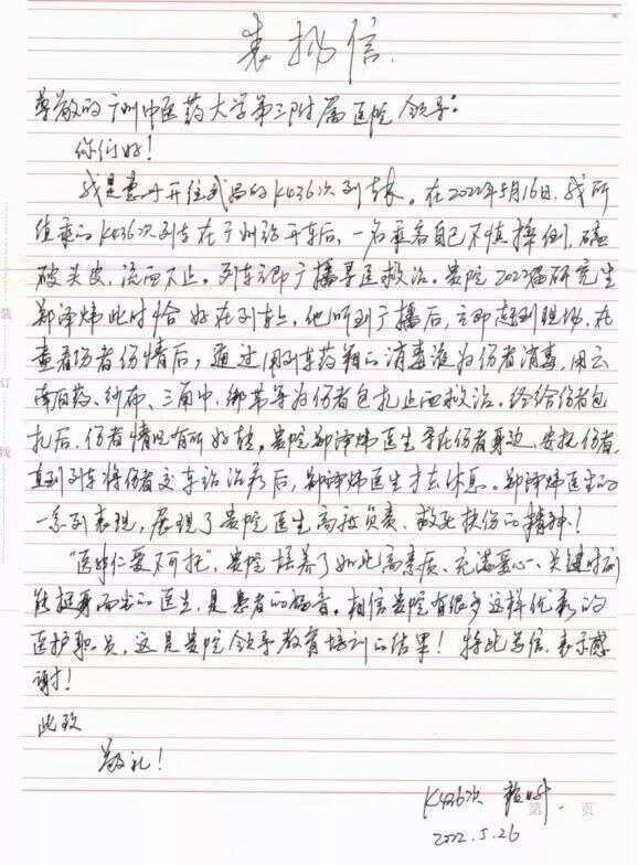 你们好!我是惠州开往武昌的K436次的列车长。在2022年5月16日,我所值乘的K436次列车在广州站开车后,一名乘客自己不慎摔倒,磕破头皮,流血不止。列车立即广播寻医救治。贵院2022级研究生郑泽炜此时恰好在列车上,他听到广播后,立即赶到现场,在查看伤者伤情后,通过用列车药箱的消毒液为伤者消毒,用云南白药、纱布、三角巾、绑带等为伤者包扎止血救治。经给伤者包扎后,伤者情况有所好转,贵院郑泽炜医生守在伤者身边,安抚伤者,直到列车将伤者交车站治疗后,郑泽炜医生才去休息。郑泽炜医生的一系列表现,展现了贵院医生高度负责、救死扶伤的精神。“医非仁爱不可托”,贵院培养了如此高素质、充满爱心、关键时能挺身而出的医生,是患者的福音,相信贵院有很多这样优秀的医护职员,这是贵院领导教育培训的结果!特此写信,表示感谢!