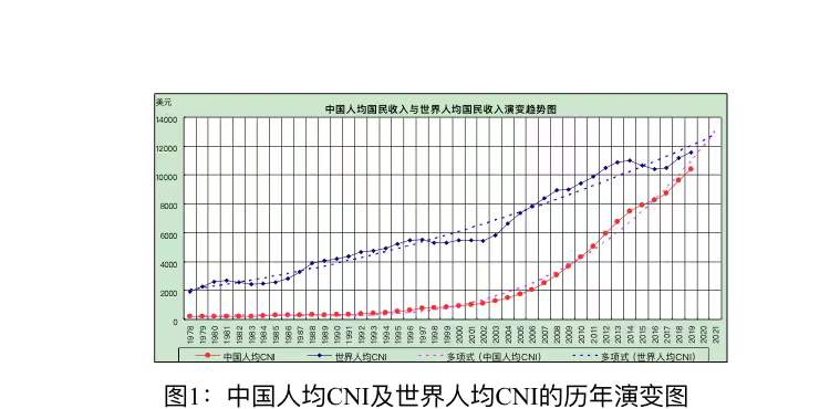 图1上方实线是世界人均CNI实际数据,上方虚线是其趋势发展线。