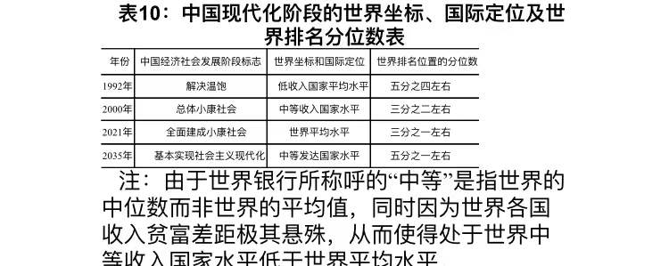 1992年中国基本解决温饱,按世界银行标准中国刚达到低收入国家的平均水平,这实际上是中国基本解决温饱时的世界坐标。2000年中国实现总体小康,按照世界银行标准中国刚迈入中等收入国家行列,这实际上是中国实现总体小康时的世界坐标。中国二〇三五年远景目标:“到2035年基本实现社会主义现代化,人均国内生产总值达到中等发达国家水平”。 [2] 这表明中国基本实现现代化时的世界坐标就是达到中等发达国家水平。那么中国实现第一个百年目标,全面建成小康社会时,中国的世界坐标是什么?到目前为止社会各界没有明确的认识。对此,学术界、理论界需要研究并给出明确判断和定位。