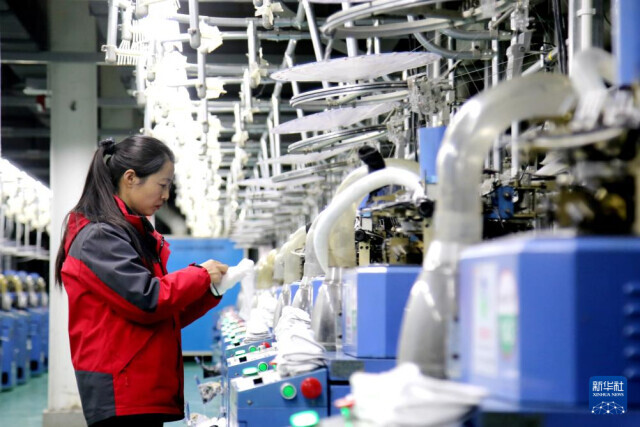 2月25日,在湖北省十堰市郧阳区一家智能纺织企业,工人在生产线上作业。