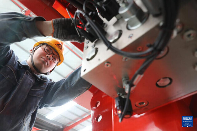 2月25日,河南省焦作市温县经济技术开发区一家企业的职工在组装调试一台电力施工机械。