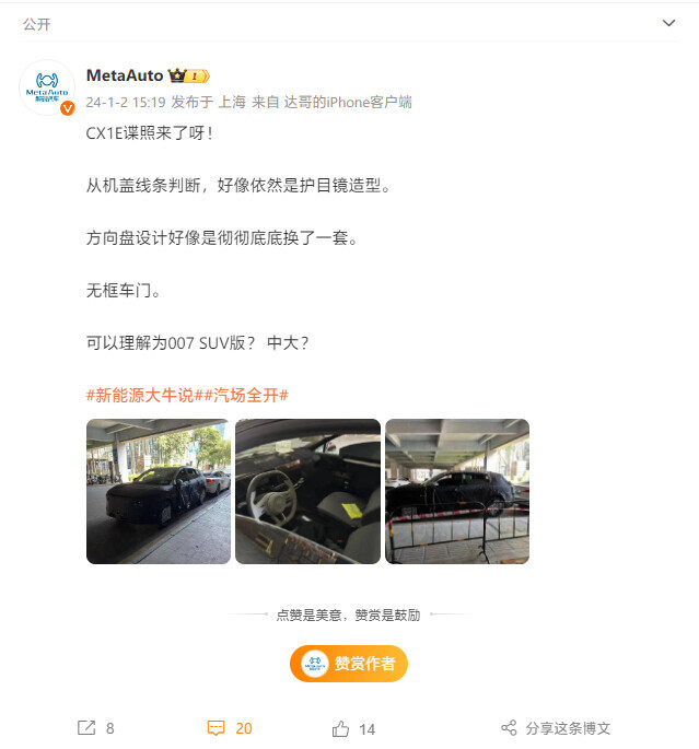 IT之家 1 月 2 日消息,博主 @MetaAuto 今天下午晒出了一组极氪全新中型 SUV 的谍照,其称该车的内部代号就是 CX1E。