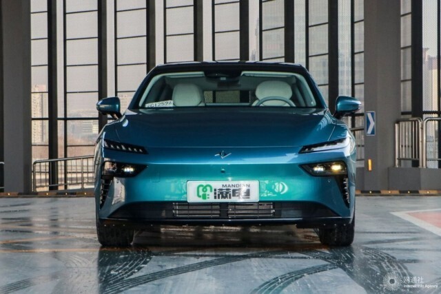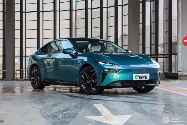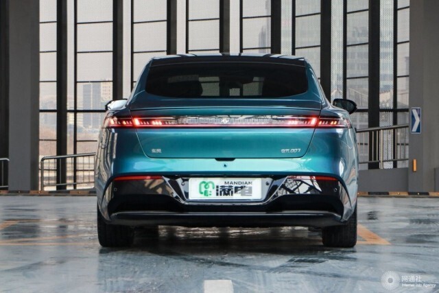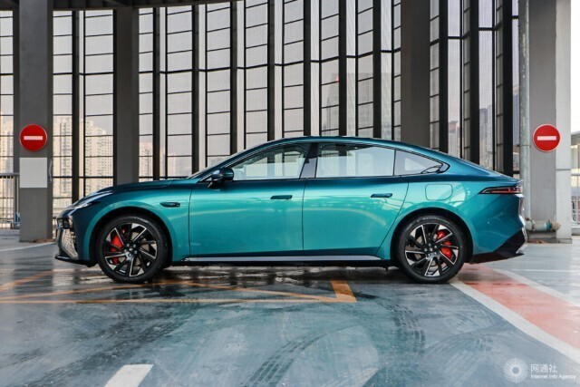 侧面来看,新车侧面造型较为流畅,略微向车尾倾斜的车顶线条搭配车窗边框处的亮黑色饰条进行点缀动感十足。此外,eπ007还配备隐藏式车门把手与亮黑色侧裙组件和大尺寸五辐式低风阻造型轮圈。车尾部分,修长的贯穿式LED尾灯组结合宽大的亮黑色后包围组件运动感、辨识度较强。值得一提的是,该车还配备了电动尾翼。