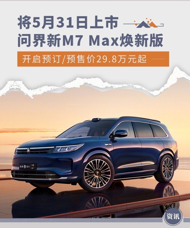 网通社快讯 问界新M7 Max焕新版开启预订,并将于5月31日正式上市。新车共推出4款车型,预售价区间29.8万-33.8万元。该车将对外观及内饰设计进行焕新升级,还新增了全新的星际蓝配色可选。另外,问界新M7 Max还将具备更加强大的智驾能力,并提供更加丰富的舒适性配置。