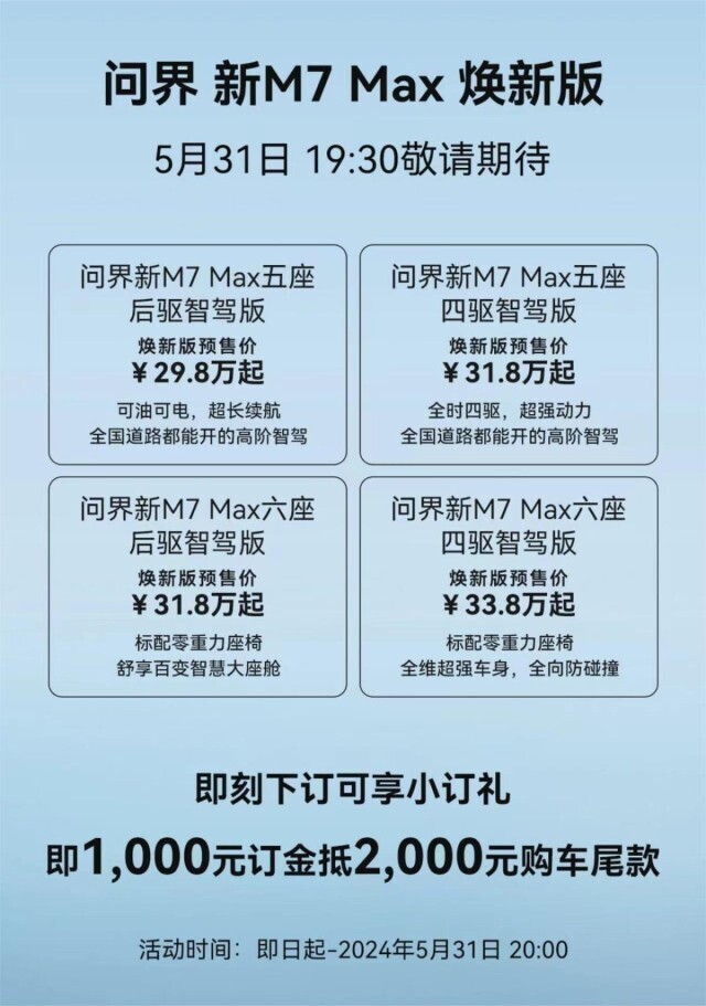 问界新M7 Max焕新版 官方预售价格 车型 预售价(万元) M7 Max 五座后驱智驾版 29.8 M7 Max 五座四驱智驾版 31.8 M7 Max 六座后驱智驾版 31.8 M7 Max 六座四驱智驾版 33.8 制表:网通社 Internet Info Agency