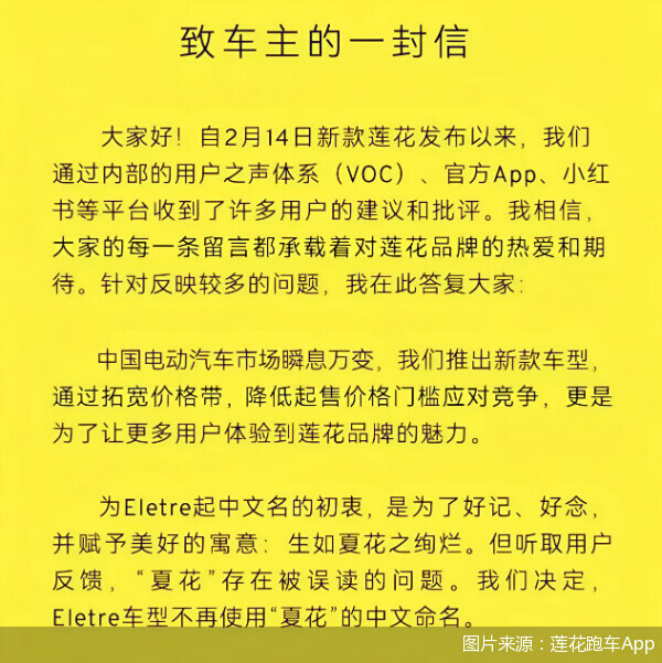 夺回“莲花”名称的路特斯,又因新车定价和名称惹上麻烦。2月19日,一封莲花中国总裁毛京波发布的《致车主的一封信》(以下简称《车主信》)称:“自2月14日新款莲花发布以来,我们通过内部的用户之声体系(VOC)、官方App、小红书等平台收到许多用户的建议和批评。针对反映较多的问题,我在此答复大家。”同时,毛京波表示,针对本次新车型推出给消费者带来的困扰,莲花意识到与用户的前置沟通做得不到位,对此深表歉意。