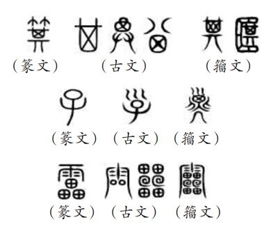 (五)所谓“9353”,指的是《说文》所收全部正篆,即《说文》分析解释的全部字。《说文》收字以篆文为“正”,作为标准字体,这就是许慎所说的“今叙篆文,合以古籀”的收字原则。“今叙篆文”,就是以篆文(小篆)作为标准正字,同时也会根据需要收列部分古文和籀文。《说文》所谓“古文”主要是孔子壁中书和民间所献古文经所用的文字,“籀文”即传为西周晚期太史籀所编字书《史籀篇》上的文字。从《说文》来看,收入的古文、籀文,主要是与篆文有明显差异的字形。如篆文“箕”“子”“雷”下所收列的古文、籀文: