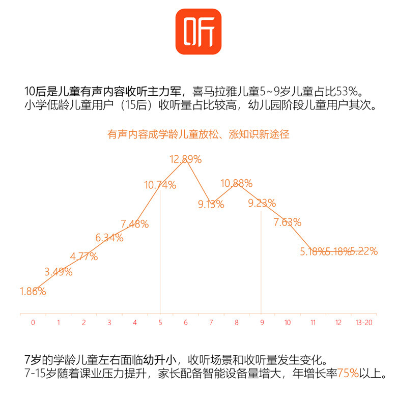 数据显示,10后是儿童有声内容收听主力军,喜马拉雅儿童5 ̄9岁年龄段收听用户占比达到53%。小学低龄儿童用户(15后)收听量占比较高,幼儿园阶段儿童用户其次。有声内容成学龄儿童放松、涨知识新途径。其中,7岁的学龄儿童左右面临幼升小,收听场景和收听量发生变化。随着课业压力提升,7-15岁阶段儿童家长配备智能设备量增大,年增长率75%以上。