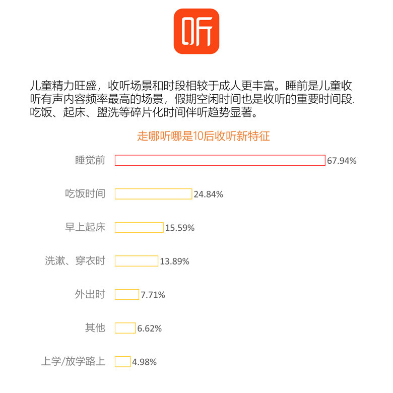 儿童精力旺盛,收听场景和时段相较于成人更丰富,走哪听哪是10后收听新特征。调研数据显示,睡前是儿童收听有声内容频率最高的场景,有68%儿童睡前收听,吃饭、起床、盥洗等碎片化时间伴听趋势显著。
