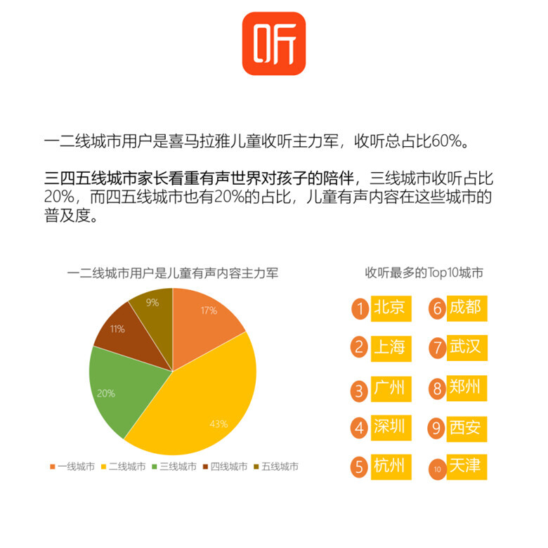 一二线城市用户是儿童有声内容收听主力军,收听总占比60%,其中二线城市占比43%。三四五线城市家长看重有声世界对孩子的陪伴,三线城市收听占比20%,而四五线城市也有20%的占比,儿童有声内容在这些城市的普及度高。北京、上海、深圳、广州、杭州、成都、武汉、郑州、西安和天津是收听最多的Top10城市。