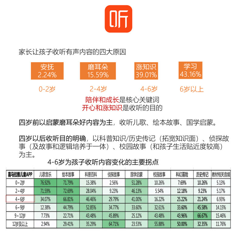 对家长而言,安排孩子收听有声内容主要是为了满足安抚、磨耳朵、涨知识和学习,陪伴和成长是核心关注点,让孩子开心并且涨知识是收听的主要目的。