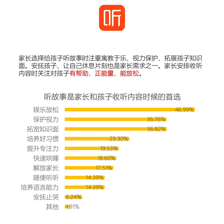 调研发现,听故事是家长和孩子收听内容时候的首选。家长选择给孩子听故事时注重寓教于乐、视力保护、拓展孩子知识面。安抚孩子、让自己休息片刻也是家长需求之一。家长安排收听内容时关注对孩子有帮助、正能量、能放松。