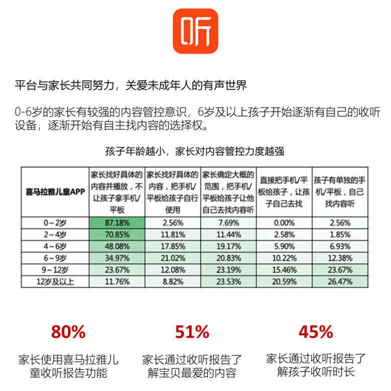 目前,平台和家长共同努力,关爱和保护未成年人的有声世界。数据显示,孩子年龄越小,家长对内容的管控力度越强。0-6岁的家长有较强的内容管控意识,6岁及以上孩子开始逐渐有自己的收听设备,逐渐开始有自主找内容的选择权。80%家长会通过喜马拉雅儿童APP中的收听报告功能关注孩子有声内容收听情况,其中51%家长会关注宝贝最爱什么内容,45%家长会通过报告查看孩子收听时长。