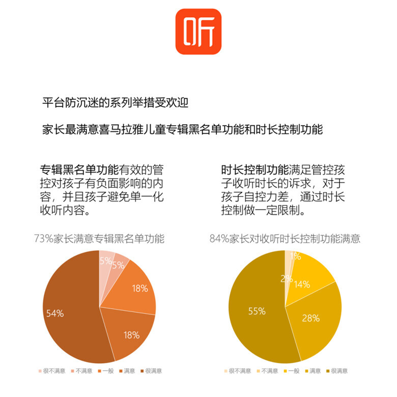 因此,喜马拉雅儿童app中防沉迷举措受到了家长欢迎。73%家长满意专辑黑名单功能,85%家长对收听时长控制功能表示满意。专辑黑名单功能有效的管控对孩子有负面影响的内容,并且孩子避免单一化收听内容。时长控制功能满足管控孩子收听时长的诉求,对于孩子自控力差,通过时长控制做一定限制。这些举措有效让孩子收听有声内容时,家长更加安心。