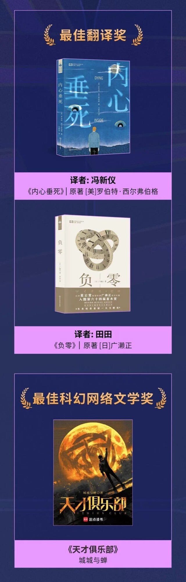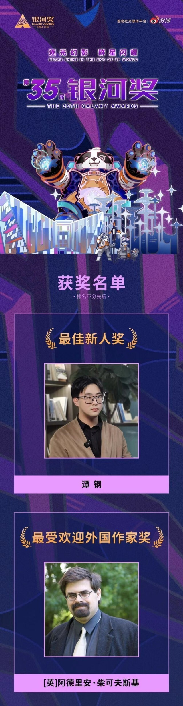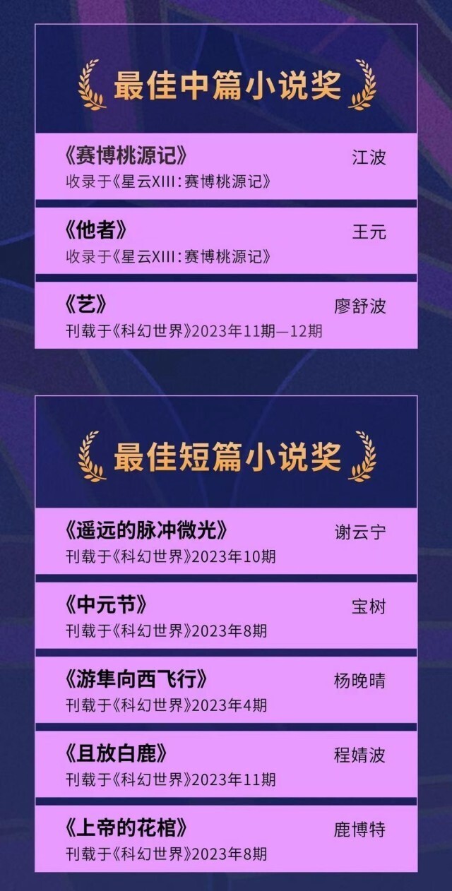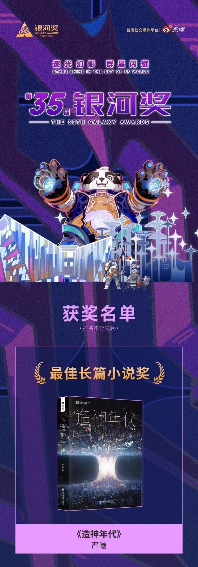 银河奖被誉为“中国科幻最高奖”。连续两年空缺的最佳长篇小说奖由严曦的《造神年代》斩获,最佳中篇小说奖为江波的《赛博桃源记》、廖舒波的《艺》以及王元的《他者》,最佳短篇小说奖分别由《遥远的脉冲微光》《中元节》《且放白鹿》《游隼向西飞行》《上帝的花棺》,最佳科幻网络文学奖得主为“城城与蝉”的作品《天才俱乐部》,最佳新人奖获得者为谭钢。