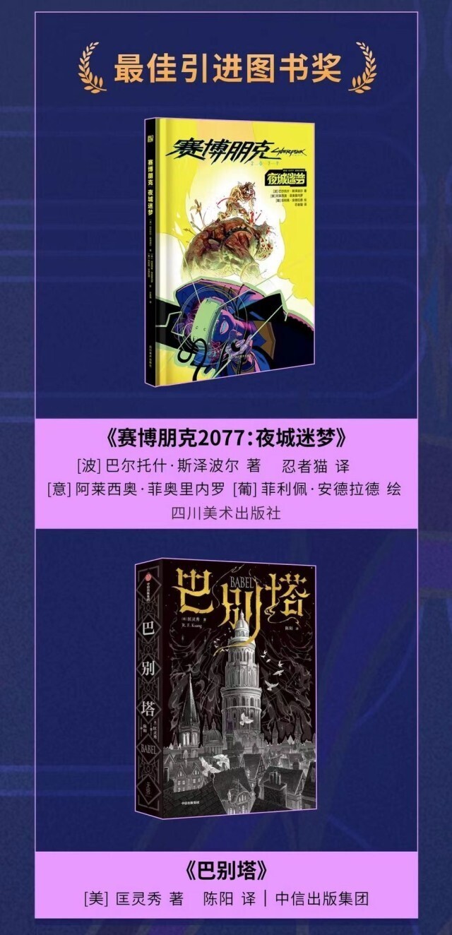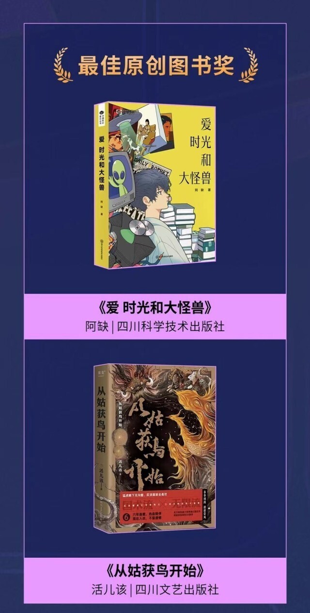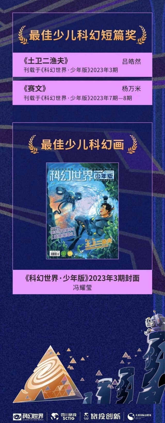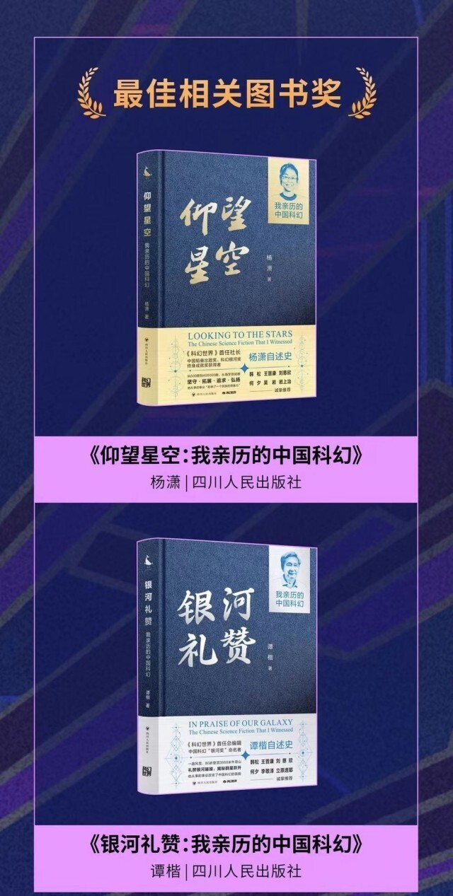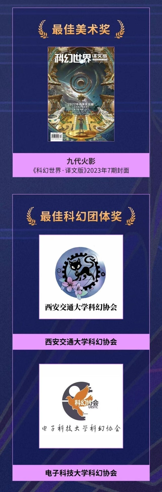 银河奖被誉为“中国科幻最高奖”。连续两年空缺的最佳长篇小说奖由严曦的《造神年代》斩获,最佳中篇小说奖为江波的《赛博桃源记》、廖舒波的《艺》以及王元的《他者》,最佳短篇小说奖分别由《遥远的脉冲微光》《中元节》《且放白鹿》《游隼向西飞行》《上帝的花棺》,最佳科幻网络文学奖得主为“城城与蝉”的作品《天才俱乐部》,最佳新人奖获得者为谭钢。