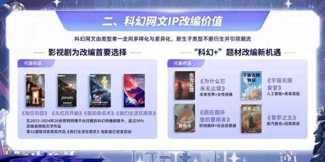科幻网文题材的百花齐放,也促使其IP改编价值加速释放。据统计,在2023-2024年20余部有明确平台归属的科幻待播剧集中,超过50%改编自科幻网文。