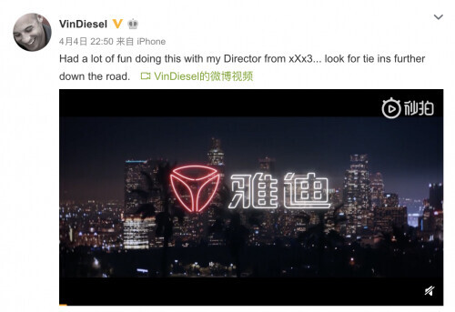 也正是在这部影片中,雅迪和范迪塞尔有了第三次“亲密接触“——雅迪将作为首个国产车类品牌加盟《极限特工4》。作为电影导演的卢卡索也表示未来雅迪和《极限特工4》电影及电视剧会有深度植入等一系列合作。