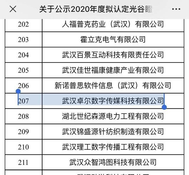 2020年9月29日,武汉卓尔数字传媒科技有限公司(以下简称“卓尔数科”)顺利入选光谷“瞪羚计划”企业名单,正式成为武汉东湖新技术开发区“瞪羚企业”中的一员。