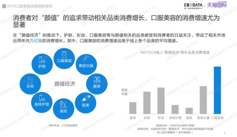 根据CBNData《2019口服美容消费趋势报告》显示,口服美容品类在近一年的消费增速远高于各个品类的平均增速。年轻人在美丽修行的各个方面,都更加注重如何“吃出颜值”,美容形式也逐渐从表面涂抹向口服形式演化。