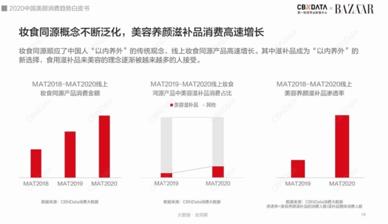 CBNData联合时尚芭莎发布的《2020中国美颜消费趋势白皮书》数据同样佐证了这一趋势,自2018年以来,线上妆食同源产品消费金额逐年攀升,而其中美容滋补品消费占比大幅提升,可见通过食用滋补品来美容的理念逐渐被越来越多的人接受。