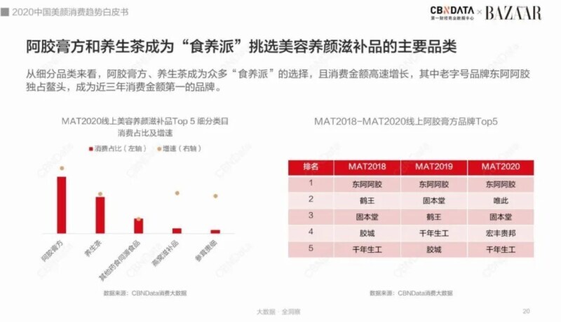 而在刚刚落幕的芭莎国际美妆大奖中,桃花姬阿胶糕跨界出圈,获得了“时尚芭莎2020年美妆大奖——年度美颜零食奖”,这也成为内服式零食和外用型美妆产品在妆食同源领域的首次“交锋”。