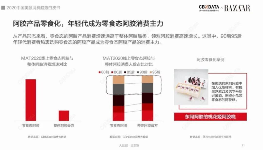 根据CBNData和时尚芭莎发布的《2020中国美颜消费趋势白皮书》数据显示,东阿阿胶的零食态产品消费增速远高于整体品类。以桃花姬阿胶糕为例,小包装的设计十分轻便,成为90、95后年轻消费者的休闲下午茶、包中常备小零食。