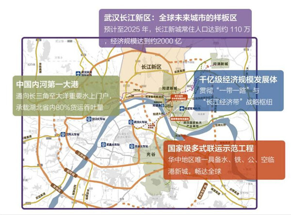 此外,华中贸易服务区已被纳入长江经济带和全国综合运输服务示范城市集疏运项目,被国家发改委、交通运输部列入武汉获批的全国第三批多式联运示范工程实施项目之一。