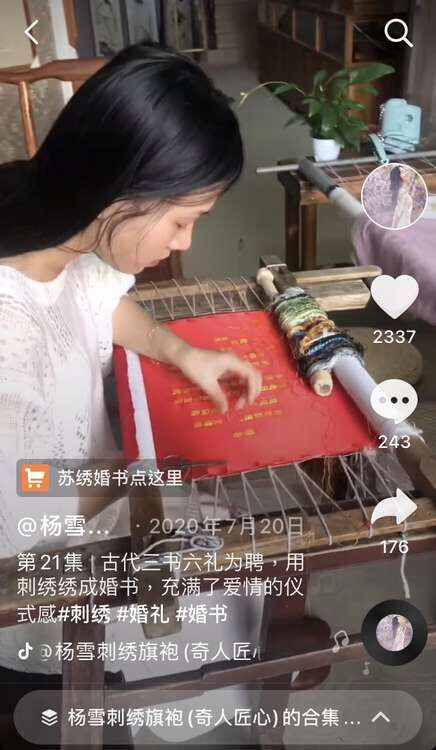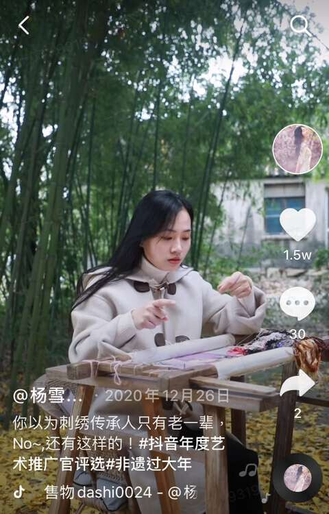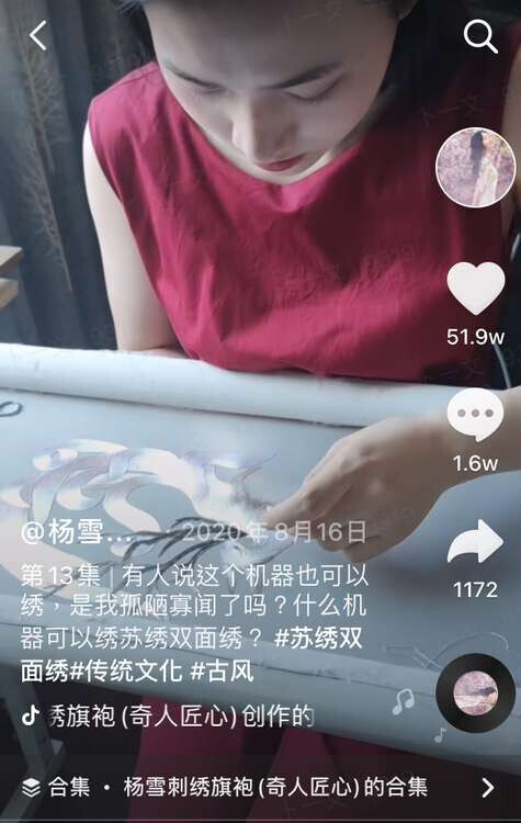 2018年,杨雪在抖音免费教了一整年苏绣,创下一节课超百万点赞、近千万人观看的纪录。杨雪也是爱美的青春女孩,但为了不让屏幕中的绣品色彩失真,她的教学视频从不开美颜,镜头也经常怼着手部拍特写,一场直播下来,观众甚至见不到她几面。用她的话说,“苏绣比我的脸重要”。