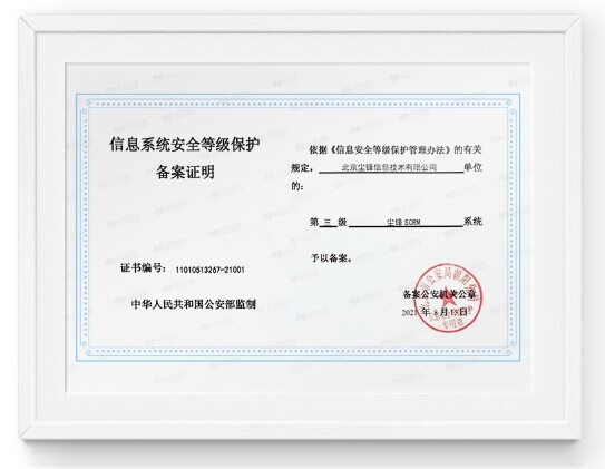 早在今年8月,尘锋SCRM就顺利通过公安部核准的国家信息系统安全等级保护三级认证,成为最早获此权威认证的SCRM系统之一。该认证是由国家信息安全监管部门进行监督、检查,主要包含信息保护、安全审计、通信保密等在内的近300项要求,共涉及测评分类73类,要求十分严格。目前,我国将信息系统的安全保护等级分为5个等级,一至五级等级逐级增高。其中,“信息系统安全等级保护三级认证”是国家对非银行机构的最高级认证,属于“监管级别”。