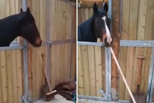 视频中,山姆牙齿咬着扫帚一端,来回扫动地上的干草,整个过程持续了近一分钟,马主人劳拉·戴维斯(Laura Davis)称山姆经常会用嘴咬住马厩周围的一些东西,但是这是它第一次咬住一把扫帚。
