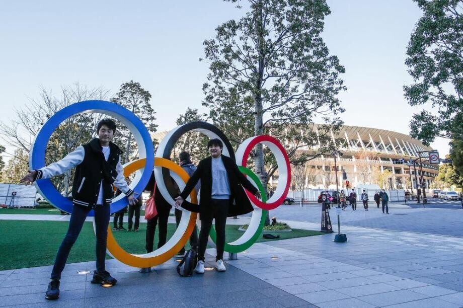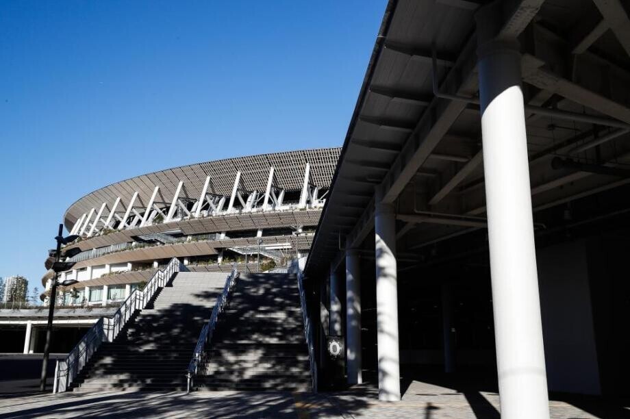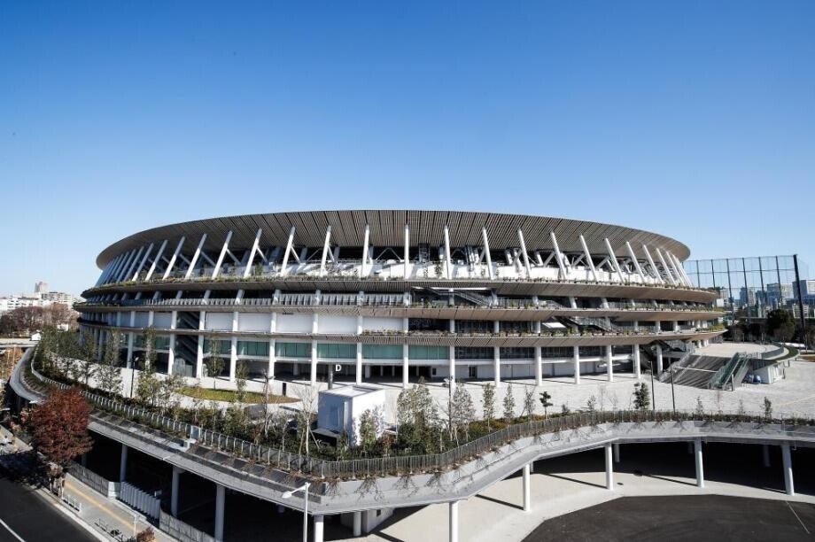 日本东京,2020东京奥运会新国立竞技场外景一览。新国立竞技场于上个月竣工,作为东京奥运会主场馆,将是2020东京奥运会及残奥会的开闭幕式举办地,不少游客到此处拍照留念。