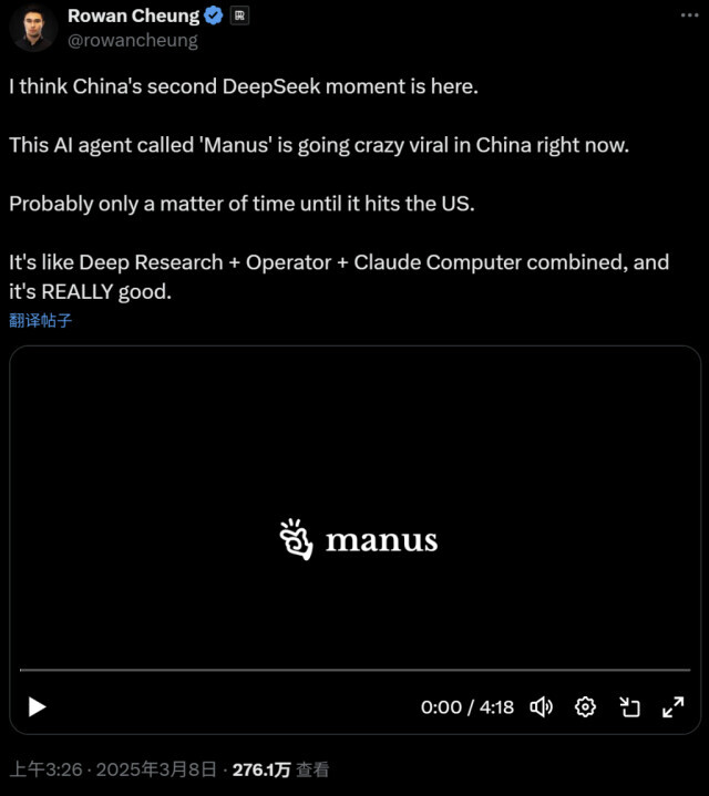 当地时间3月8日,AI资讯平台The RundownAI的创始人Rowan Cheung在X(原推特)平台上转发了Manus的介绍视频并写道:“我认为中国的第二个DeepSeek时刻已经到来。”对Manus进行多项测试之后,Cheung称Manus令他感到印象深刻,完成任务的准确率很高。