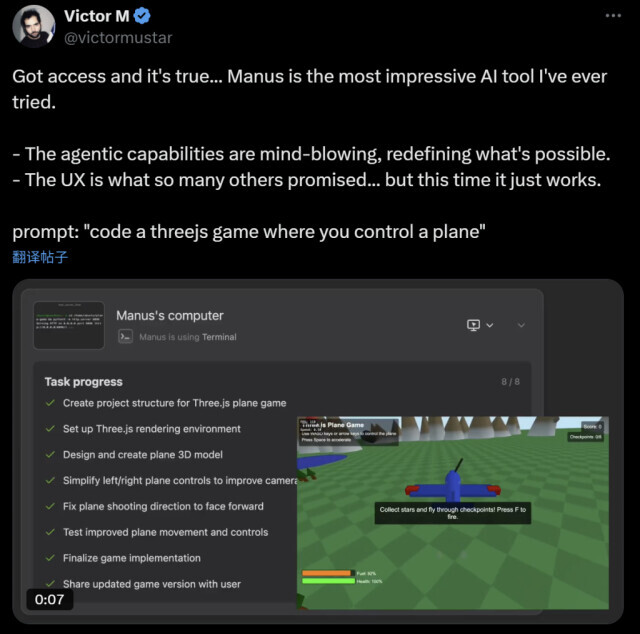 开源社区平台Hugging Face的产品负责人Victor Mustar也在体验过Manus之后对其表示赞扬,称其为“我所使用过的最令人印象深刻的AI工具”。Mustar展示了一个使用Manus编写的飞机小游戏,从视频中来看,该游戏基本完全符合他的要求。