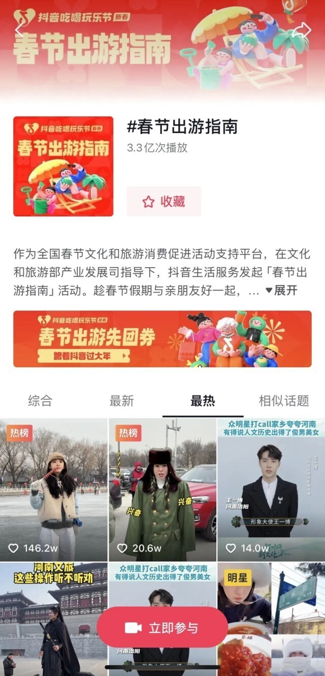 抖音生活服务联合10省、直辖市文旅官方号,向全抖音推荐家乡好去处。推荐内容将集合展现在 #春节出游指南 抖音话题下。