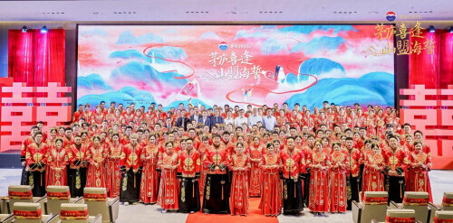 此次集体婚礼贵州茅台酱香酒营销有限公司作为合作方倾情相伴,茅台1935喜相逢,为新人们喜上加喜,更有广汽传祺组建专属的爱情车队为新人们保驾护航,在蜿蜒的山路上留下一道道亮丽的风景线,同时也传递出对环保出行的积极倡导。此外,江西仙客来生物科技有限公司也为每对新人精心准备了长情伴手礼,通过别样的方式传达着对新人的美好祝愿。