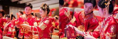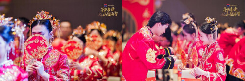这是一场经过精心策划的传统中式集体婚礼。着华服,跨囍门,入华堂,新人们感受着传统婚礼的庄重与现代浪漫交织的美好氛围。新妇却扇,夫妻对拜,共饮合卺酒,相亲不相离,新人们共同举杯,相对而饮。那不仅仅是美酒入喉,更是两颗心紧紧相连的誓言。从此,他们将携手共度风雨,永结同心,白头偕老。