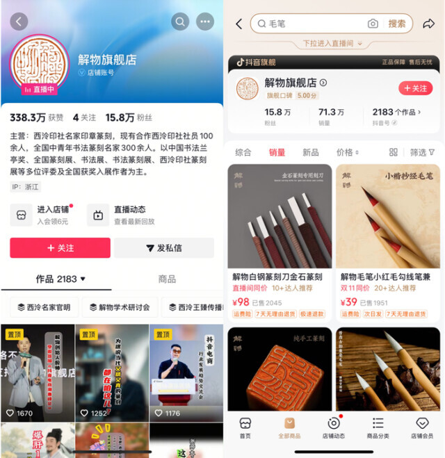 “起初,他们找过我几次,我都没同意。后来接触以后才发现,他们很敬业也很专业,所以就签了合同。”徐谷甫说。在解物旗舰店主页可以看到,短短数年间,店铺已经销售各类书法、篆刻,以及篆刻刀、毛笔等,超过71万件。