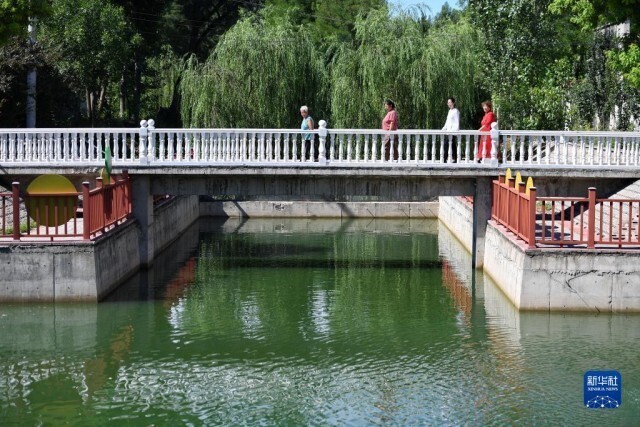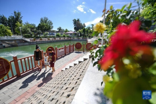 7月16日,村民在河北省涿州市东仙坡镇西仙坡村由垃圾坑塘经过治理建成的游园内行走。