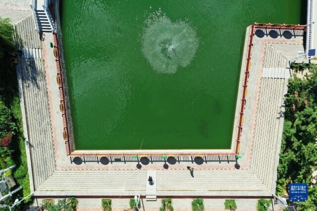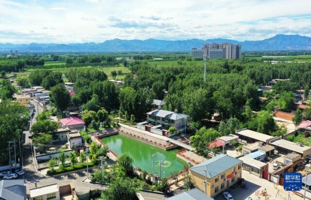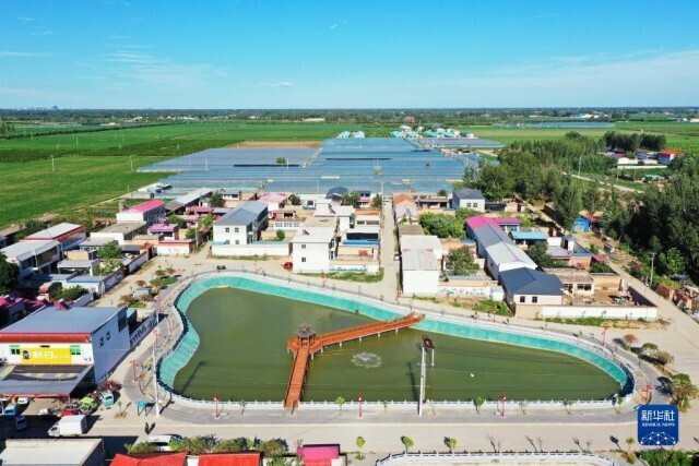 河北省涿州市东仙坡镇西仙坡村由垃圾坑塘经过治理建成的游园(7月16日摄,无人机照片)。