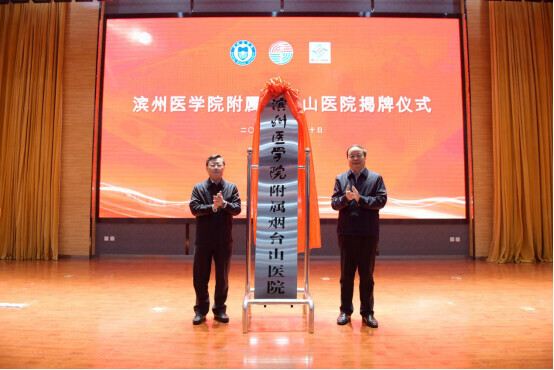 烟台市副市长李波与滨州医学院党委书记车先礼为附属烟台山医院揭牌。高森 摄