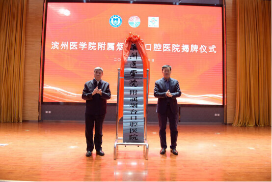 滨州医学院院长赵升田与烟台市卫健委主任包信勇共同为附属烟台口腔医院揭牌。高森 摄