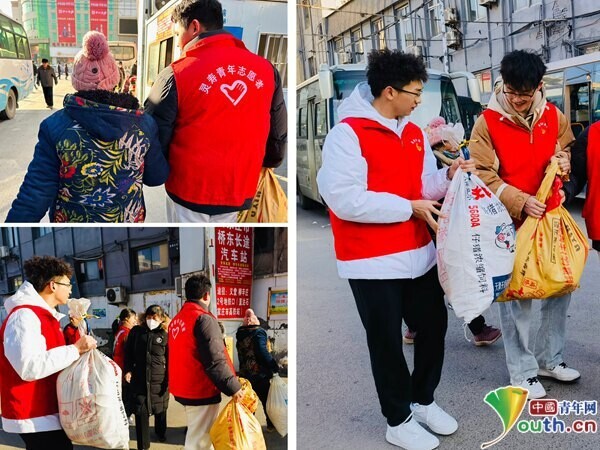 在客运站出口处,青年志愿者们主动“搭把手”帮助返乡乘客搬运行李,为来往旅客提供交通指引、行李搬运、弱势群体帮扶、问询解答等便民志愿服务,帮助他们在春运期间顺利返乡、安全出行、温暖过节。