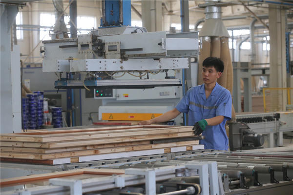 兰考县一家家居企业的生产车间里,工作人员在处理家具板材。