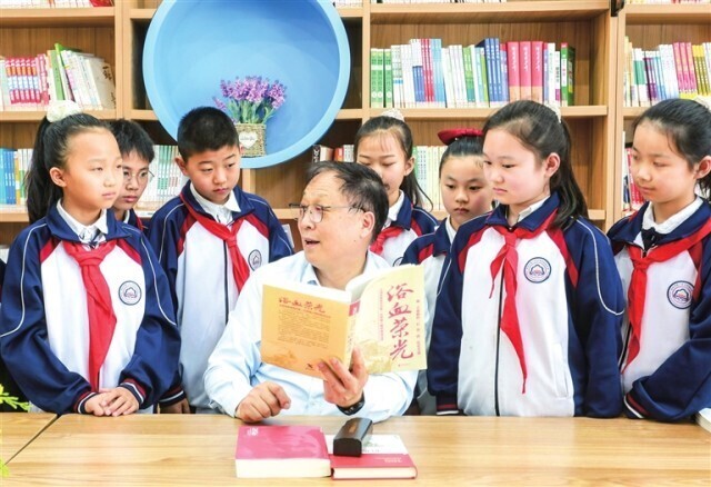 梁海磊(中)在南阳市第二完全学校为学生们讲述红色历史 王浩 摄